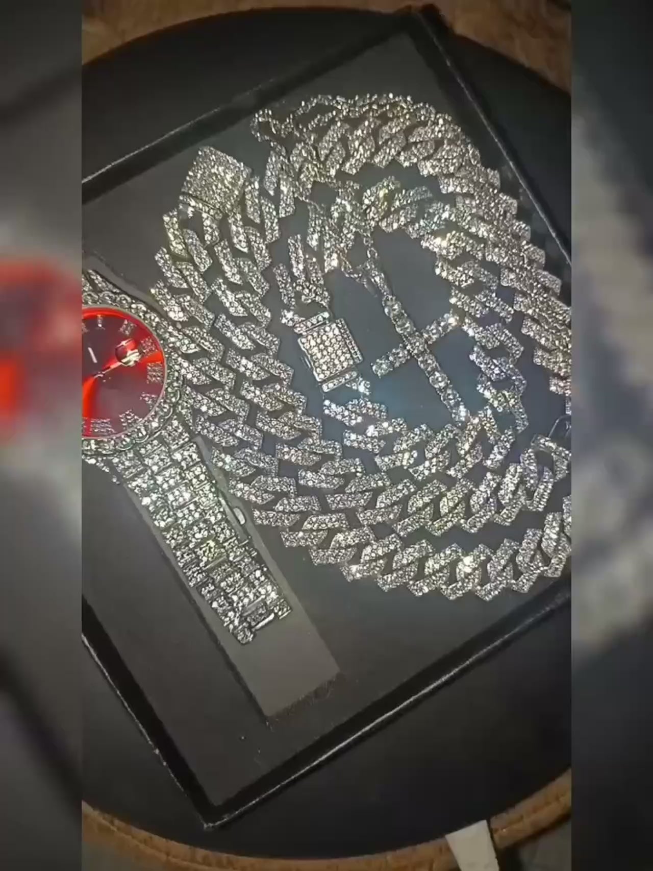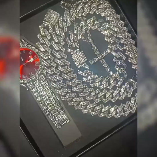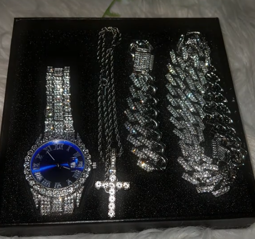 4 pieces. Watch, chain, bracelet, cross. All iced out. All coordinated.